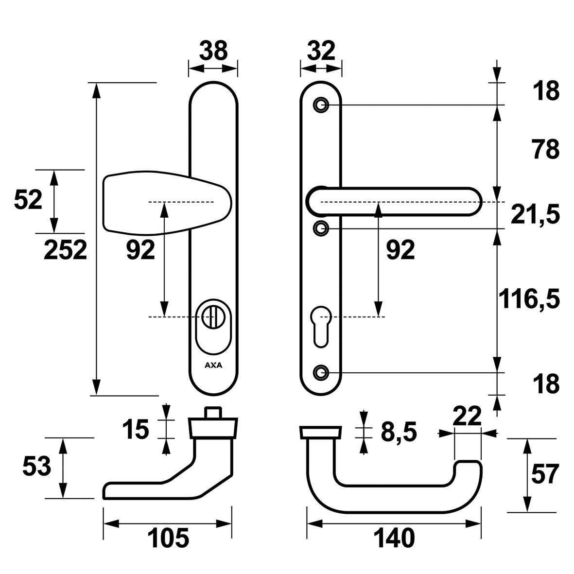 - Kann standardmäßig an Türen mit einer Dicke von 38 bis 54 mm verwendet werden, für dickere Türen sind verlängerte Griffstifte und -bolzen erhältlich